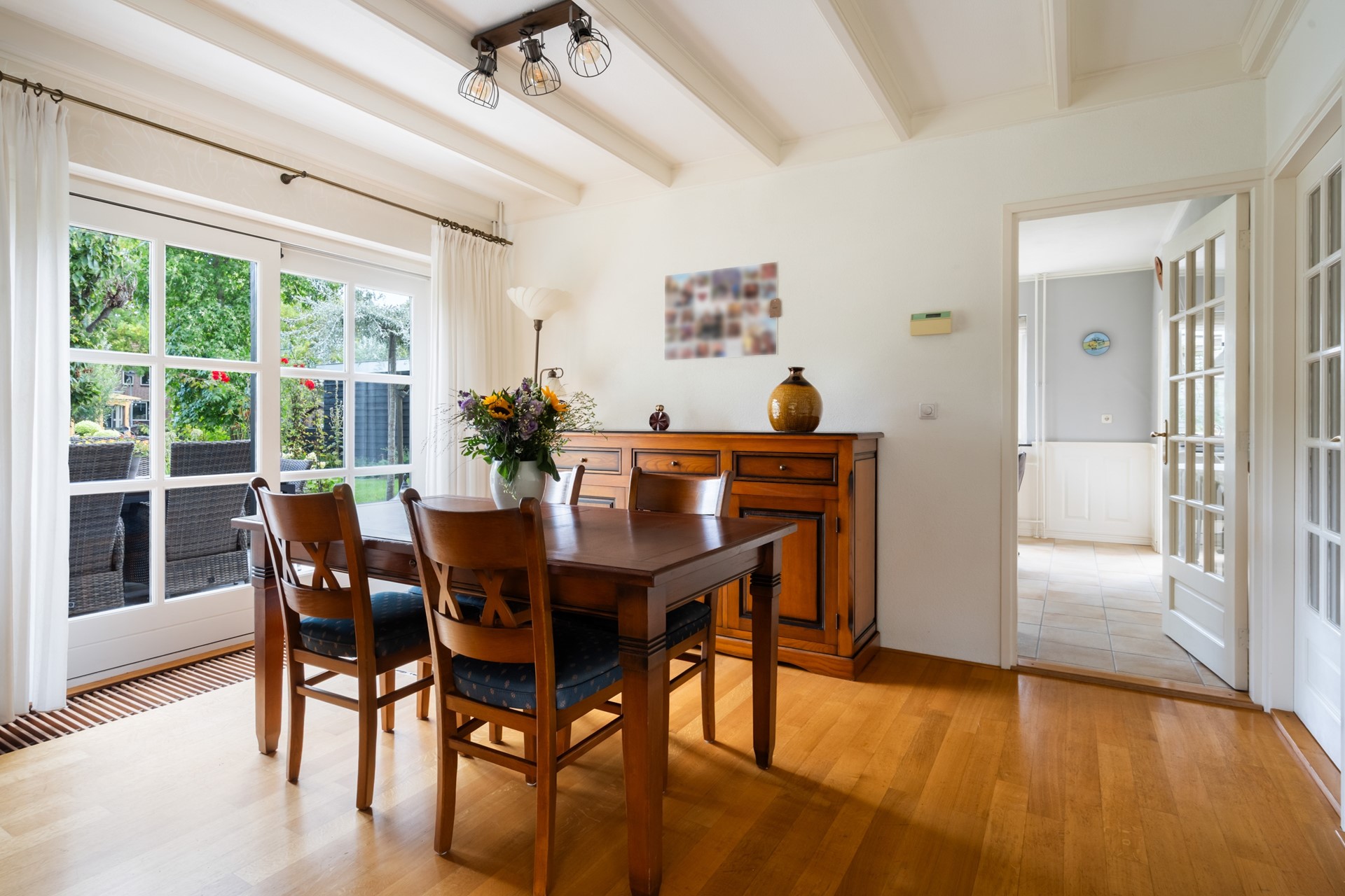 De royale woonkamer profiteert van veel daglicht door de raampartijen rondom, wat zorgt voor een prettige en natuurlijke indeling van de leefruimtes. Aan de voorzijde van de woning bevindt zich een ruime zithoek, terwijl aan de achterzijde een gezellige eethoek kan worden gecreëerd, direct grenzend aan de keuken. De grote schuifpui vormt een mooie verbinding tussen de woonkamer en de zijtuin. De open haard bij de zithoek zorgt voor extra sfeer en warmte tijdens de koudere maanden. De woonkamer is afgewerkt met een laminaatvloer.