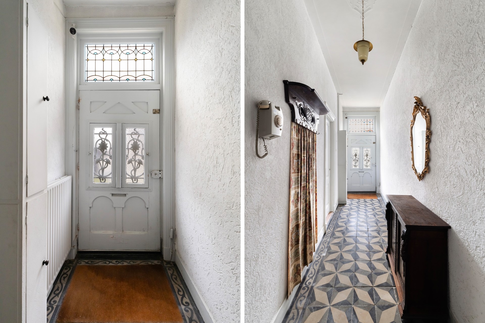 Via de voordeur met gietijzeren deurroosters betreedt u de statige en ruime hal.