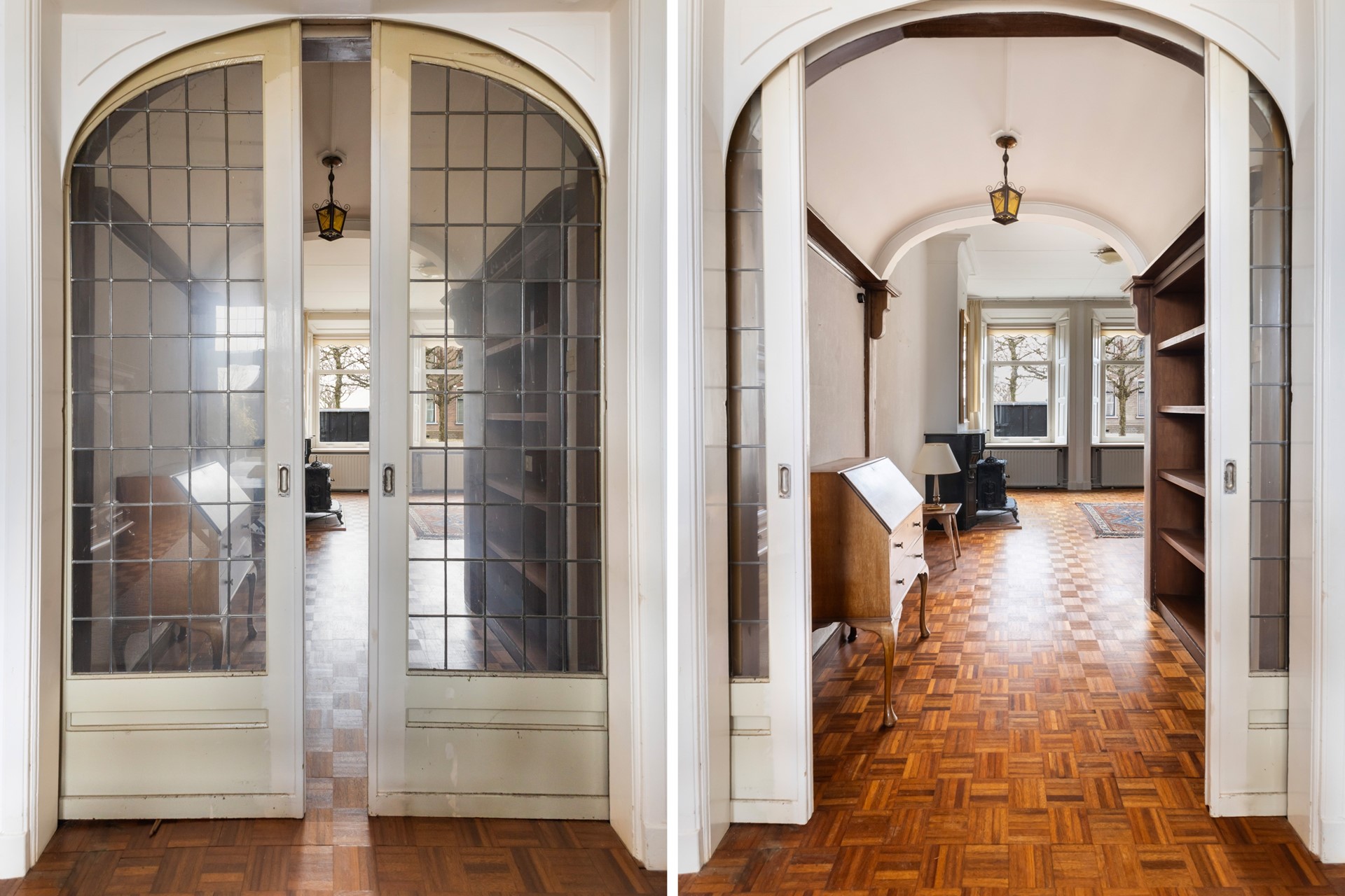 De woonkamer is middels en-suite deuren met boogvormige belijning en glas-in-loodpanelen opgedeeld in een voorkamer en een eetkamer. De voorkamer beschikt over twee hoge schuifvensters met originele binnenluiken en een natuurstenen schouw. De eetkamer is aan de achterzijde gesitueerd en voorzien van een raampartij met glas-in-lood bovenlichten en dubbele tuindeuren, die een fraaie verbinding met de achtertuin creëren. De woonkamer is afgewerkt met een massief houten mozaïekparket in blokpatroon, passend bij het karakter van de woning.