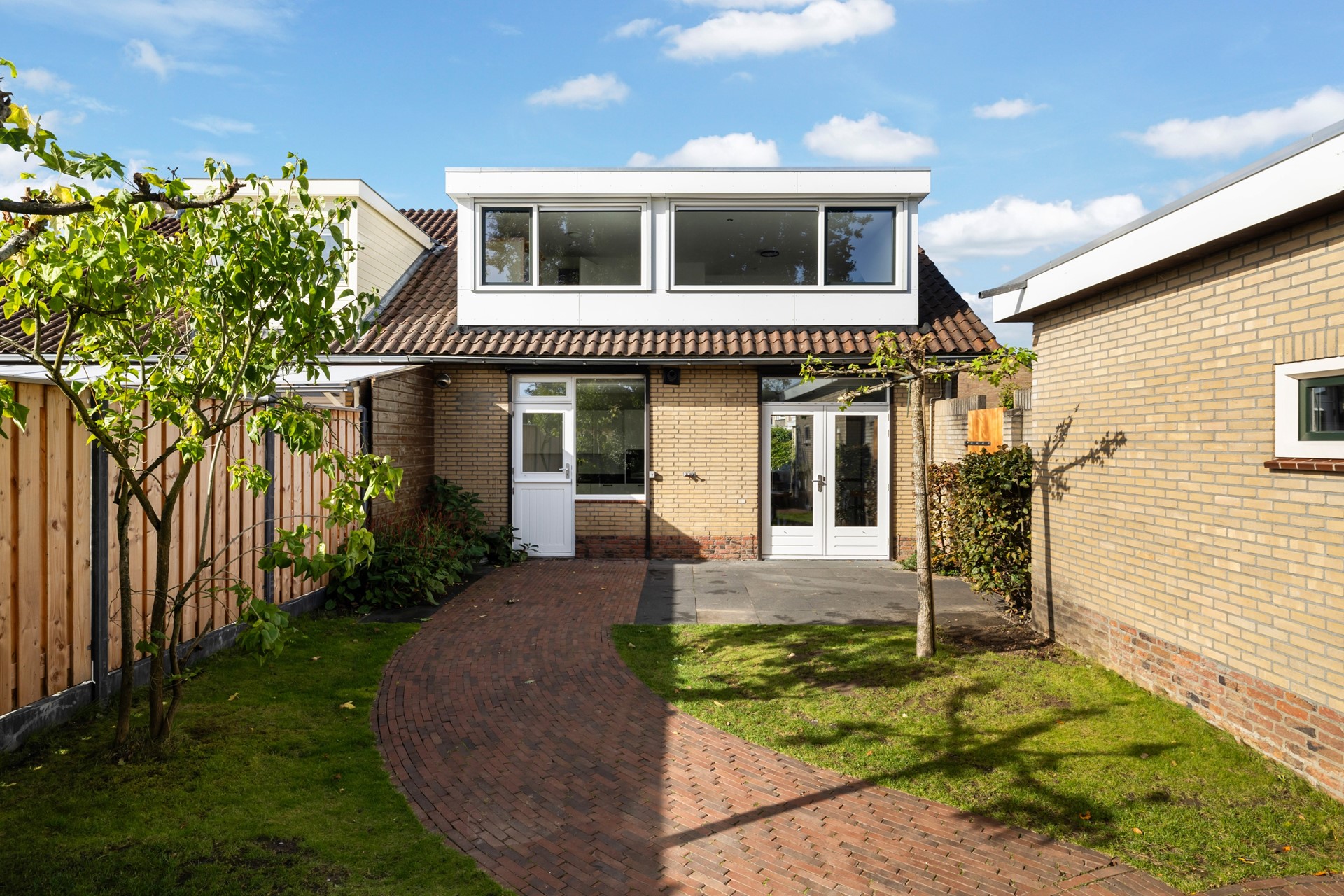 De achtertuin beschikt over een terras met sierbestrating, een gazon en rondom aangelegde borders met gevarieerde beplanting, waaronder een centraal geplaatste dakboom en een volwassen hoogstamboom. Er is voldoende ruimte voor een royale eettafel met stoelen en een comfortabele loungeset.