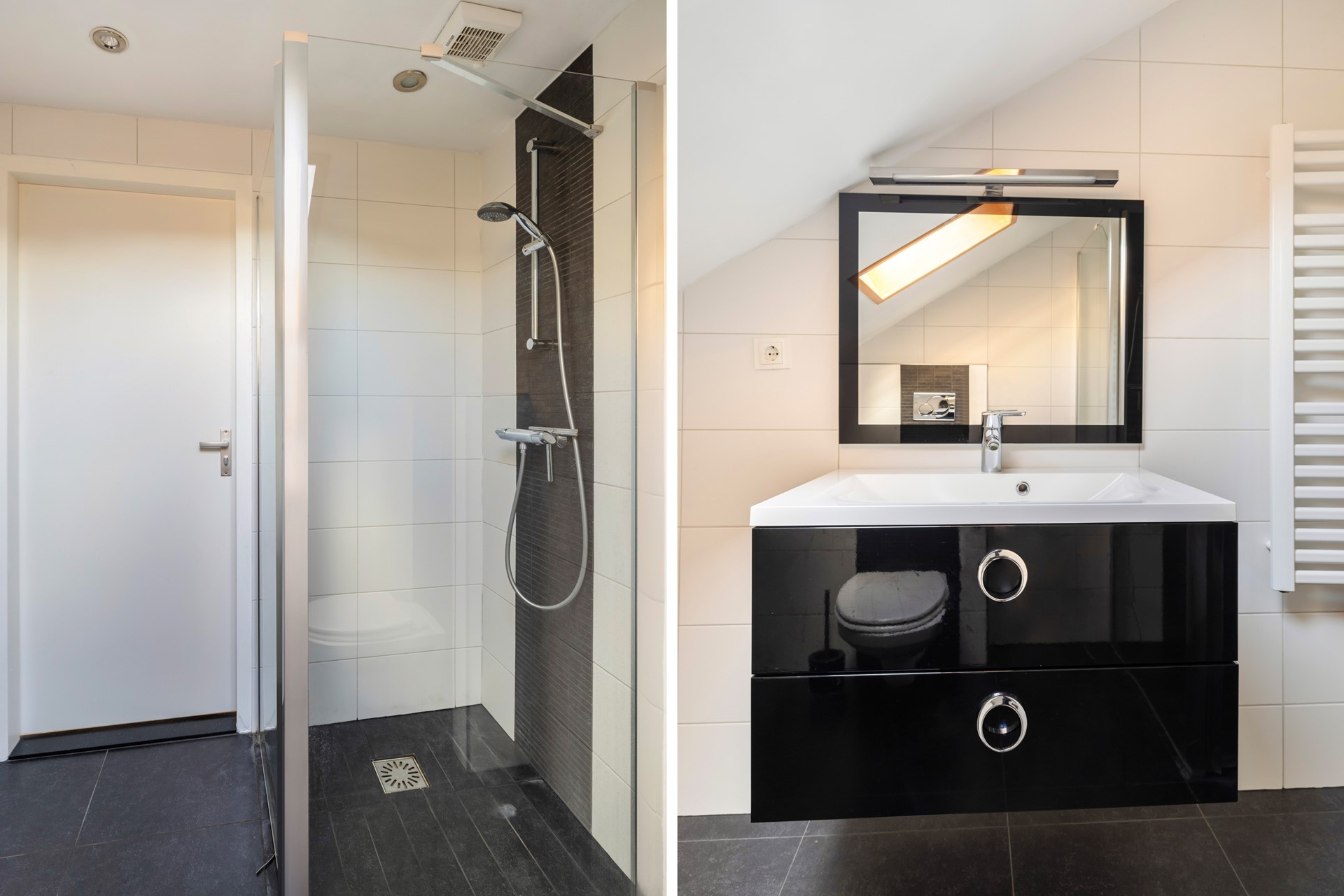 De royale badkamer is voorzien van een dakvenster en volledig betegelde wanden en beschikt over een douchecabine, wastafelmeubel met wastafel, hangend closet en een handdoekradiator.