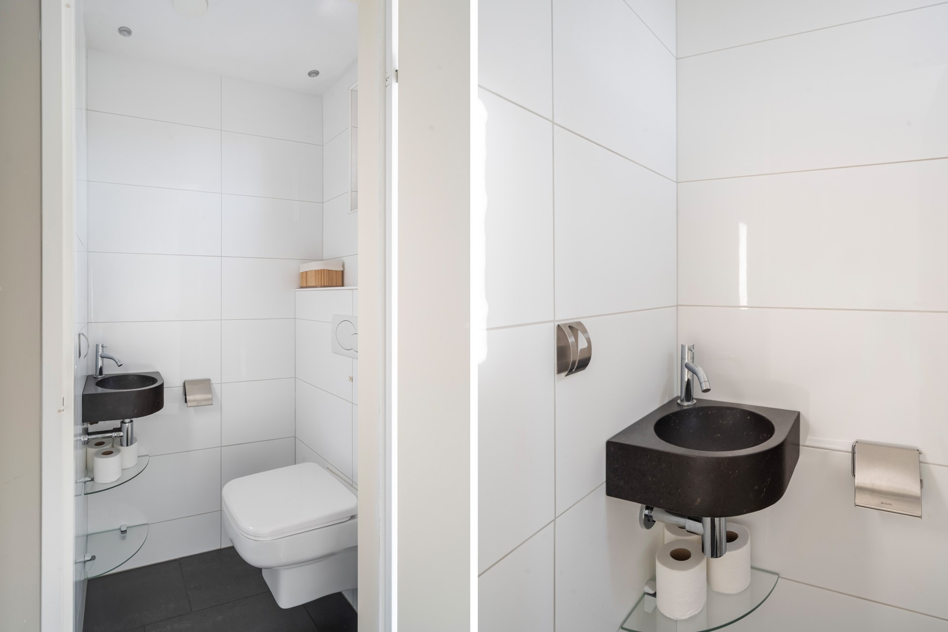 Entree, hal met meterkast, trapopgang en volledig betegelde toiletruimte met hangend closet, fonteintje en een venster.