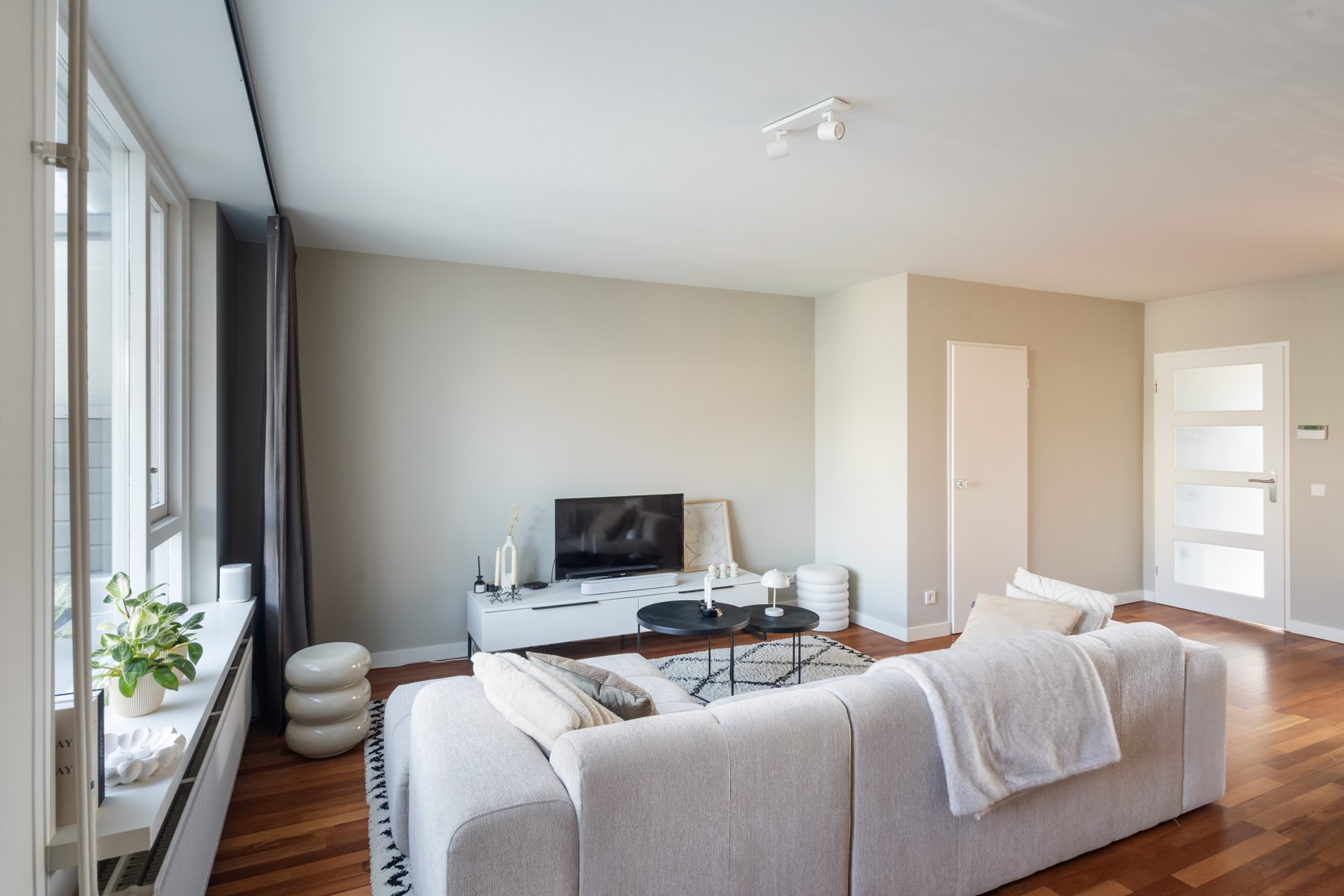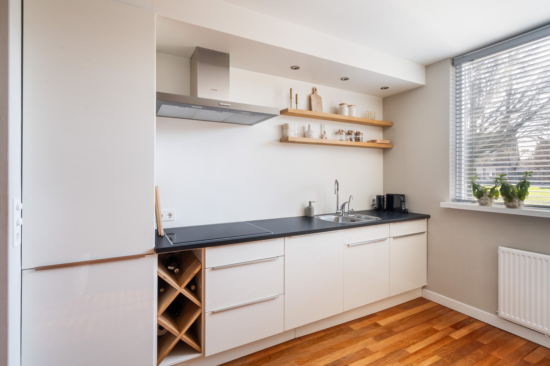 De woonkamer is tuingericht en heeft prettig daglicht door de grote glaspartij. De open keuken aan de voorzijde van de woning is voorzien van een rechte keukenopstelling, uitgevoerd in mat wit met een antraciet gelamineerd aanrechtblad, inductiekookplaat, RVS-afzuigschouw, vaatwasser en close-in boiler. In de bijbehorende parallel geplaatste kast is de combimagnetron geplaatst.