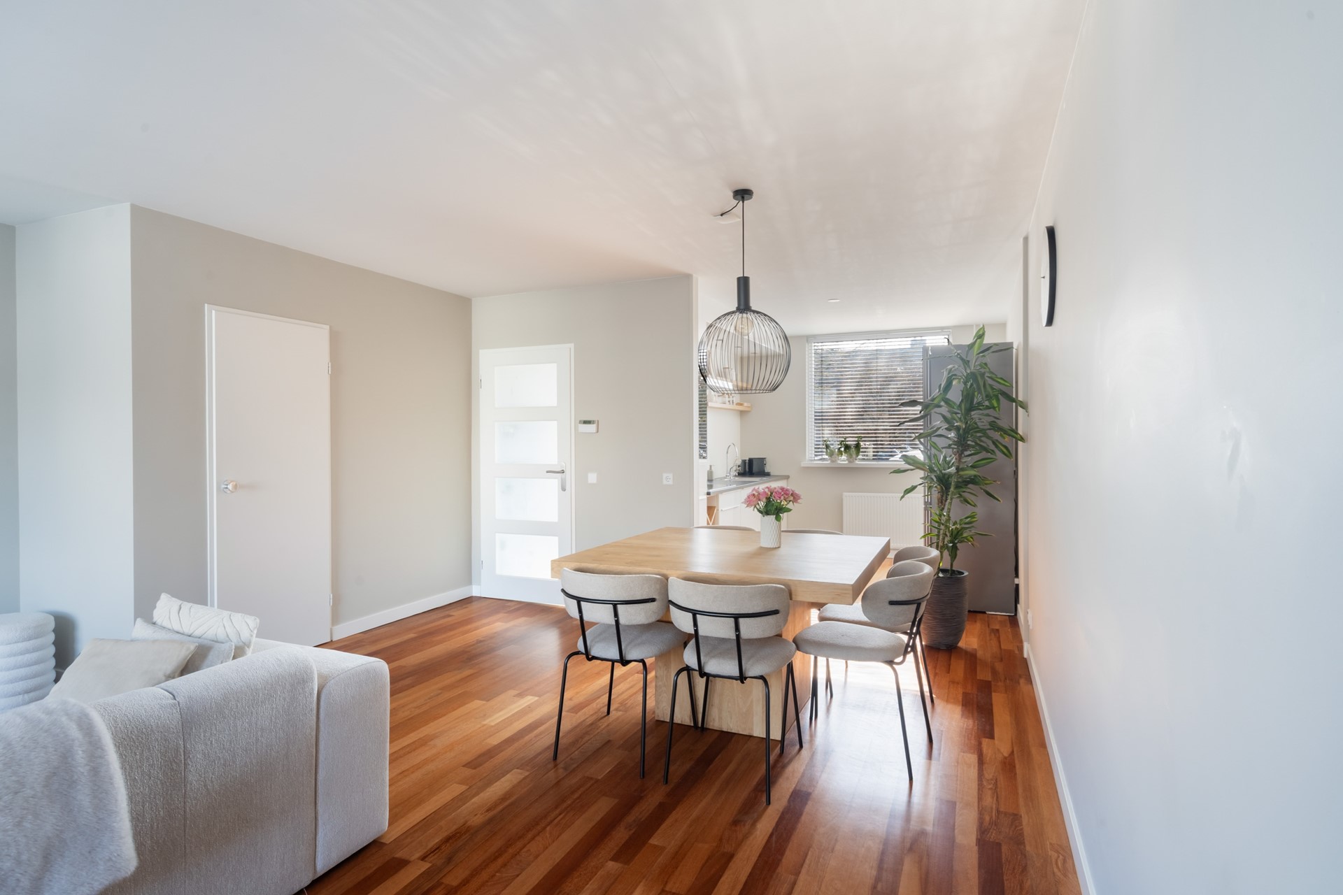 Het gedeelte aan de voorzijde van de woning leent zich perfect voor een fijne, ruime eethoek nabij de keuken. Aan de achterzijde is er ruimte voor een riante zithoek. De tuindeur verbindt de woonkamer met de veranda en de achtertuin. De woonkamer is voorzien van een trapkast met praktische bergruimte en afgewerkt met een massief hardhouten vloer.