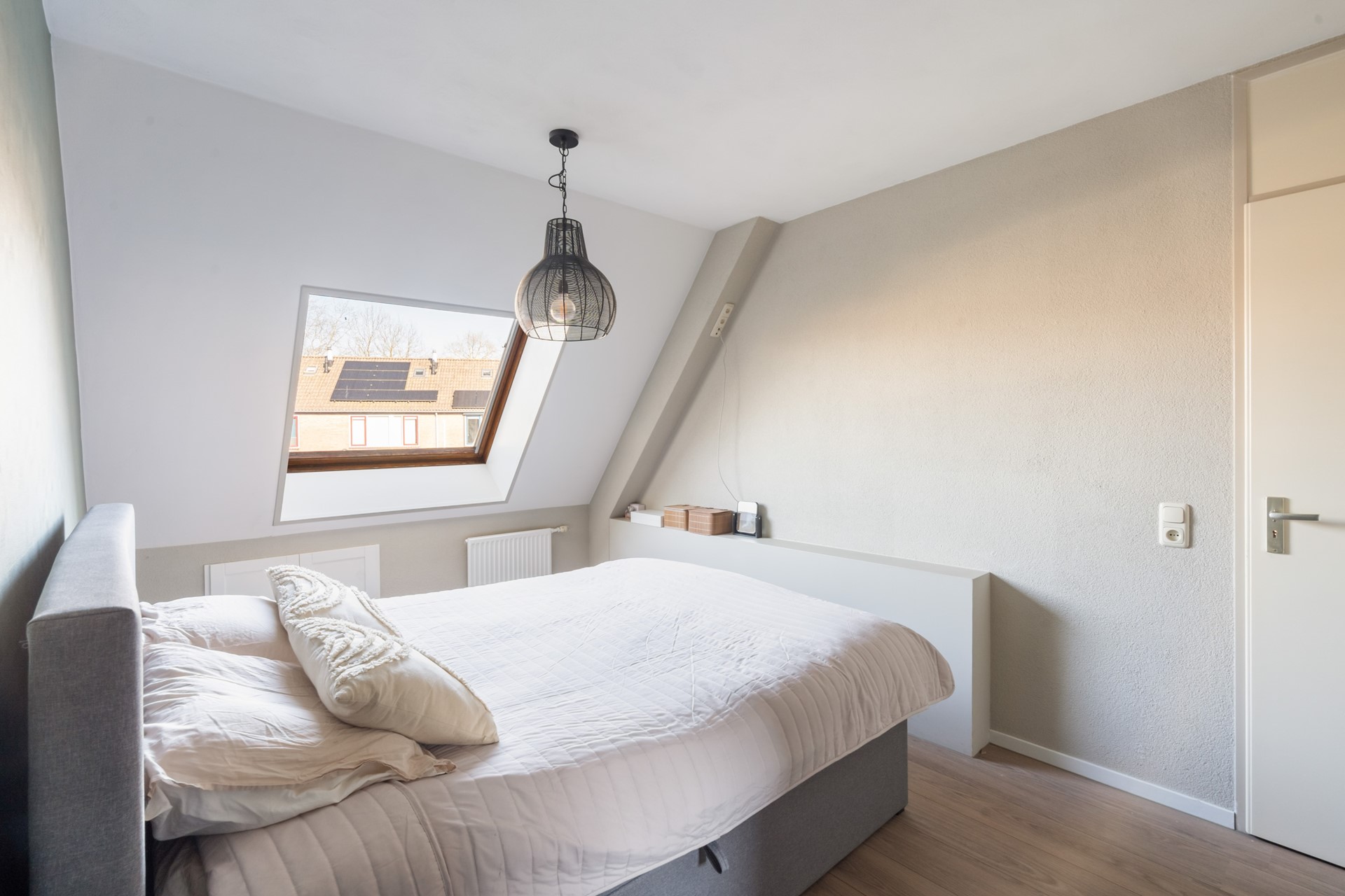 Praktische voorzolder met dakvenster, cv-opstelling en wasmachineaansluiting. Slaapkamer voorzien van een Velux dakvenster en bergruimte achter de knieschotten.