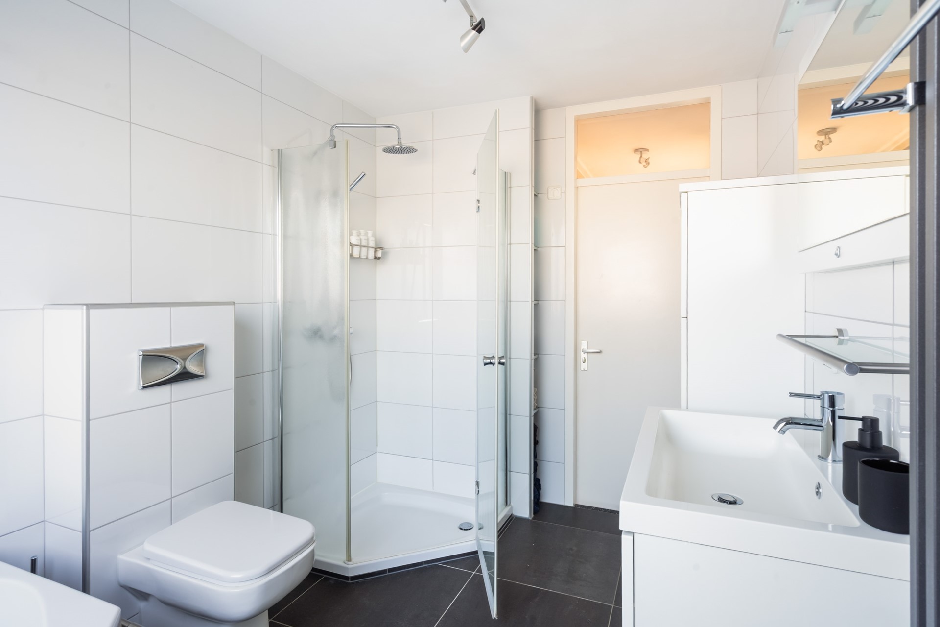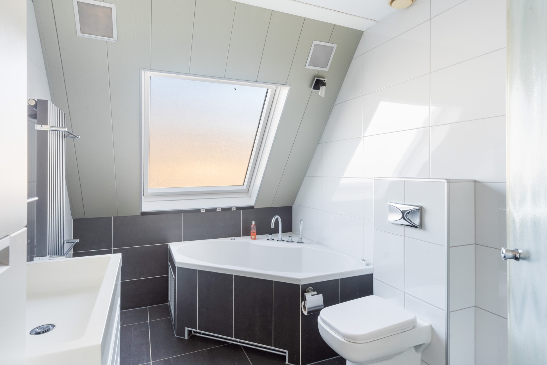 Ruime badkamer met dakvenster, volledig betegelde wanden en voorzien van een ligbad (bubbelbad), inloopdouche, wastafelmeubel met wastafel, verlichte spiegel, hangend closet, designradiator en elektrische vloerverwarming. De verdieping is afgewerkt met een laminaatvloer.